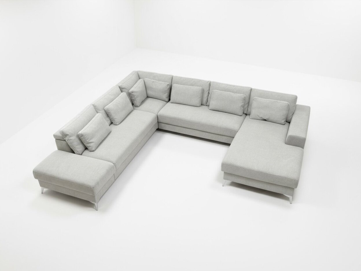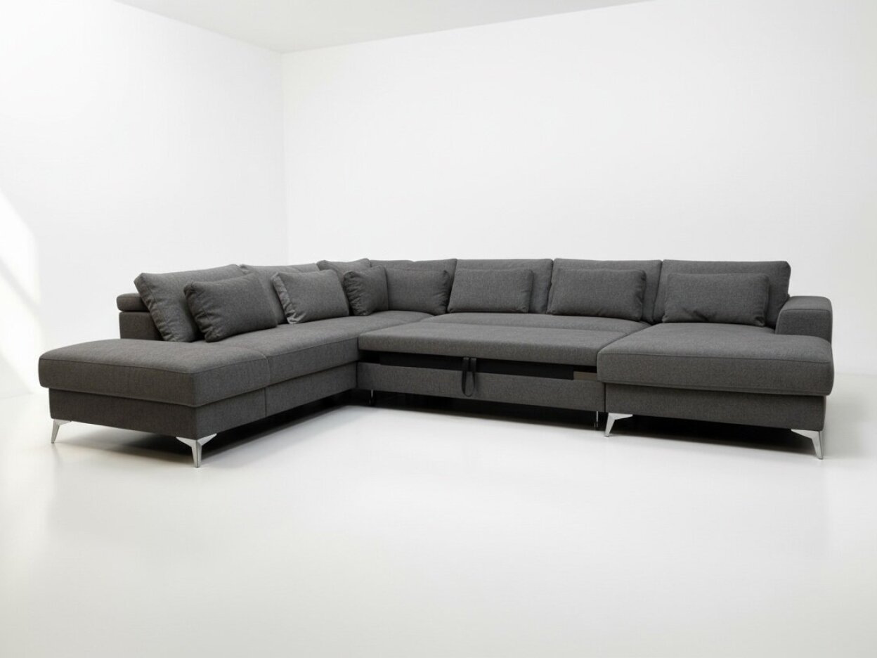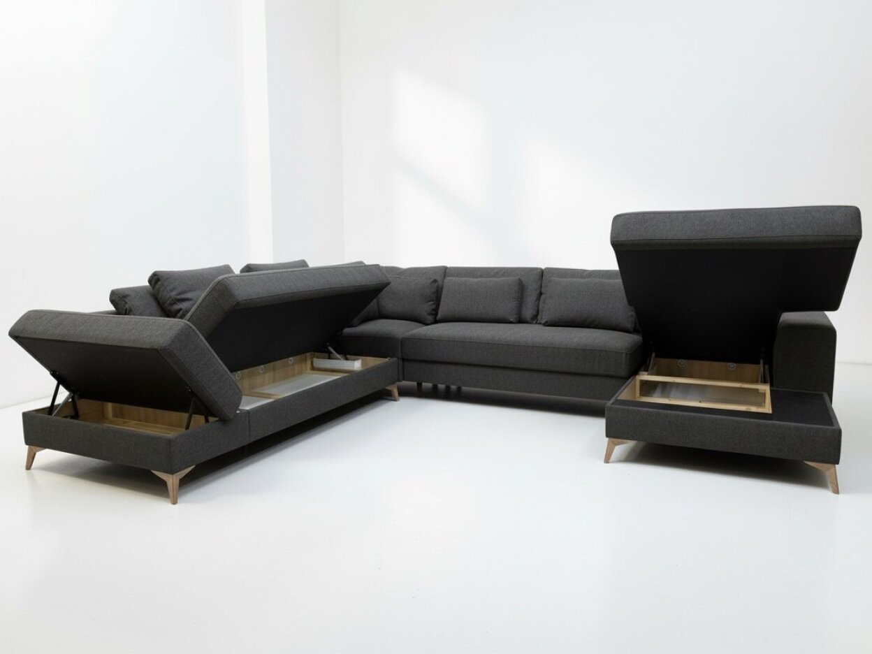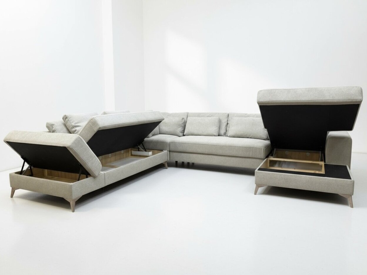 Im Modell Oded sind die Kissen mit natürlichen Federn gefüllt, wodurch beim Hinsetzen ein Gefühl von angenehmer Umhüllung und einem entspannten „Einsinken“ in das Sofa entsteht. Das Möbel verfügt über eine großzügige Schlaffunktion sowie über Module mit Bettkasten, die mit Automatikmechanismen ausgestattet sind und das Öffnen erleichtern.