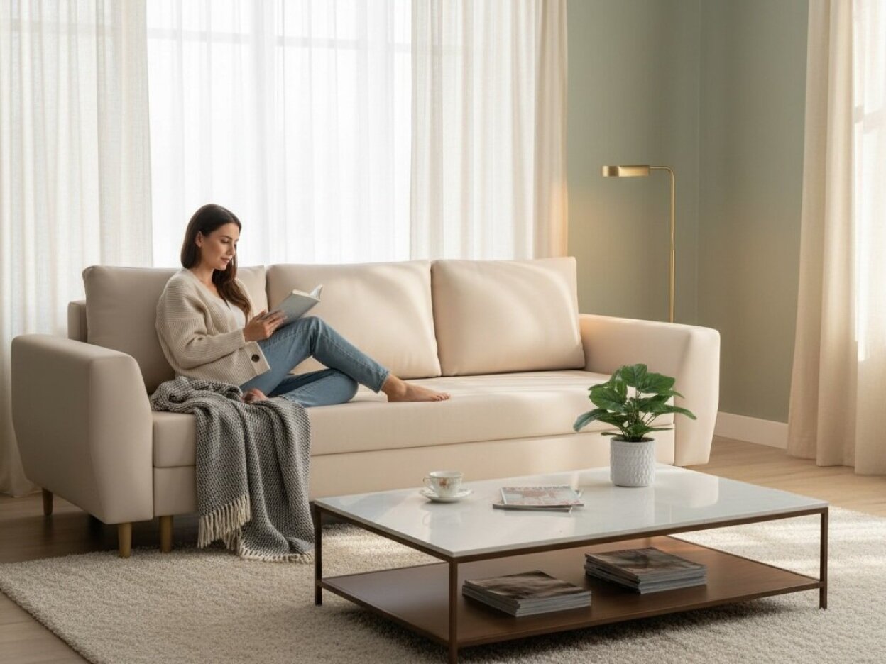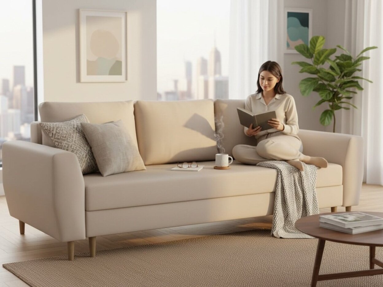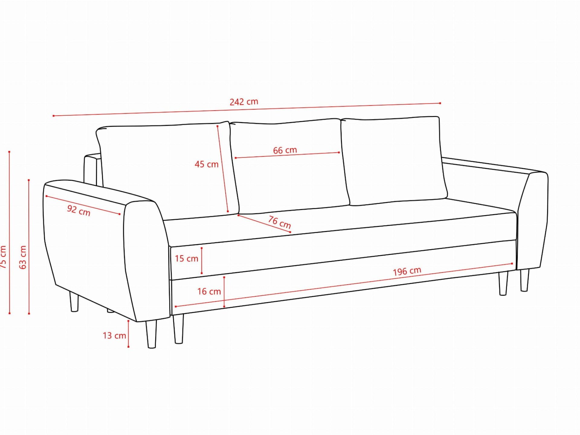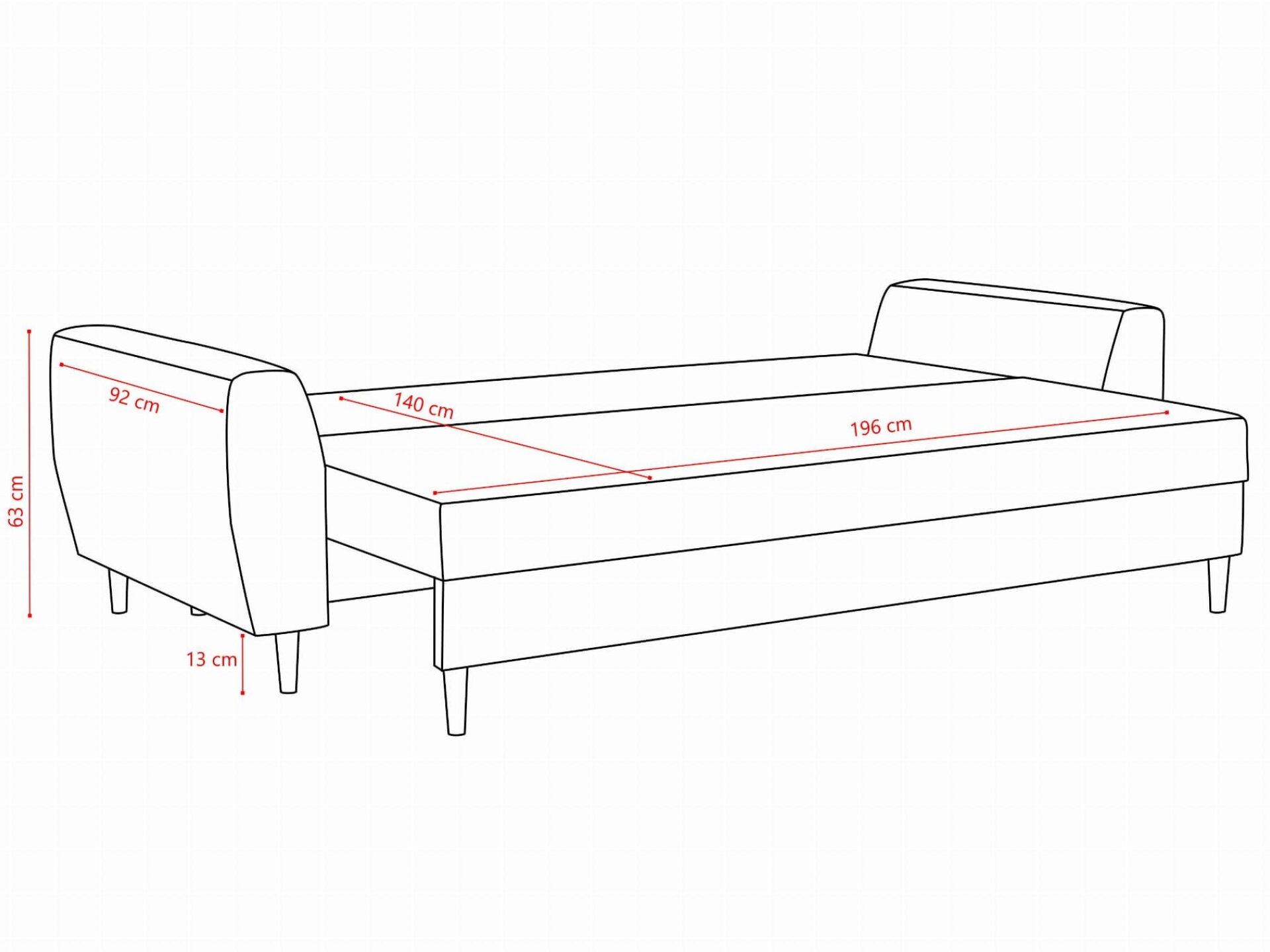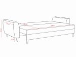 Das Sofa ist mit Kissen mit abnehmbarem Bezug ausgestattet, die mit Schaumstoff gefüllt sind. Zusätzlich verfügt das Sofa über eine Schlaffunktion sowie über Bettkästen unter jeder Sitzfläche.